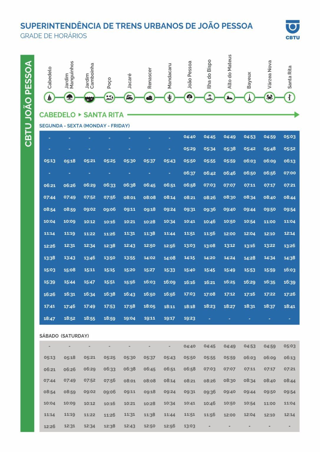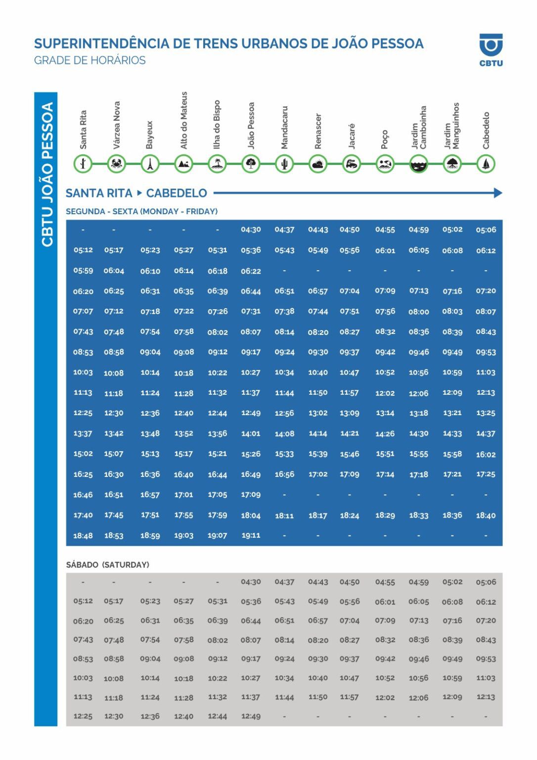 Os trens iniciarão suas operações às 4h30 com destino a Cabedelo e às 4h40 para Santa Rita, encerrando as atividades diárias às 19h23.